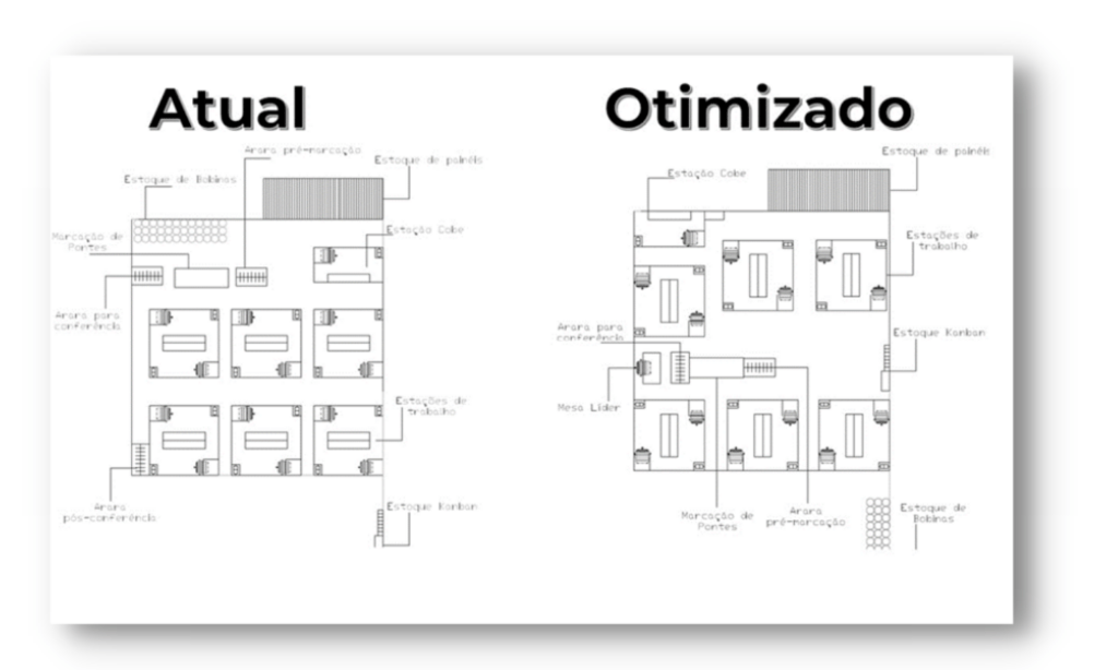 Criação de um layout otimizado por meio da análise e priorização das relações entre postos de trabalho e áreas de apoio à produção, focando na redução de movimentações e otimização do fluxo de pessoas, materiais e informações.